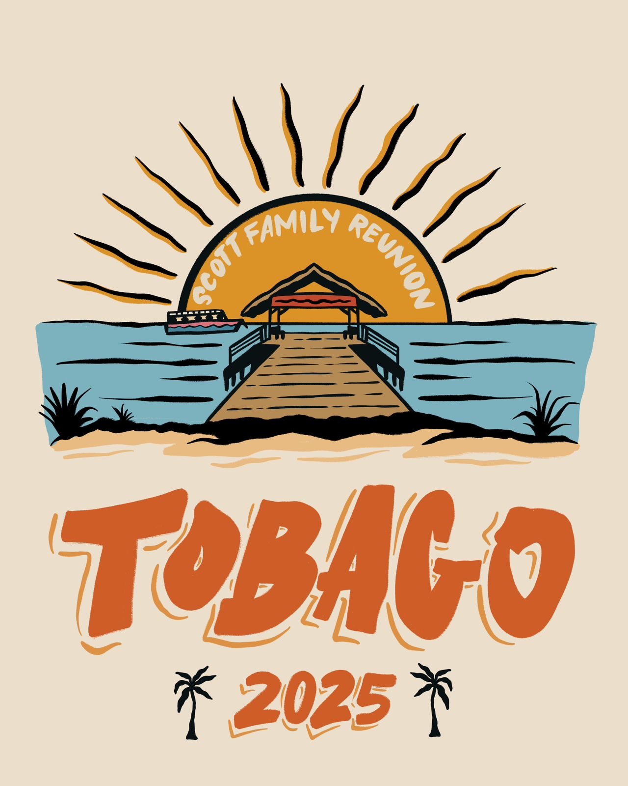 Each family has a PNG file and a mock up file linked below. You will give both these files to the printer. The mock up shows the printer what the print should look like on the T-shirt. Printers usually like to get uneditable files so you will not be able to make any changes to the design, which guarantees that all T-shirts are the same (except the color of “Tobago 2025” which will be in each family’s color).